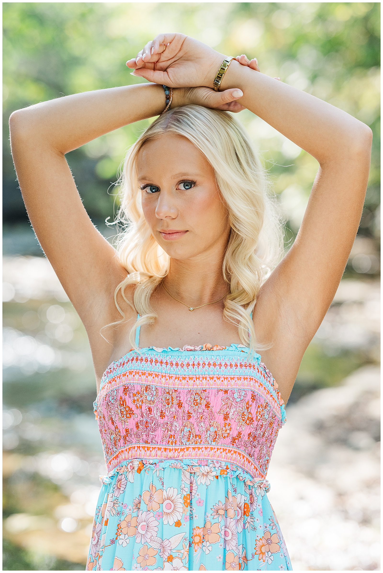I loved the dress Shanah chose! And looking at her images- aside from the leaves, you’d never know these were taken at the end of October! That light and warmth gave a mid-summer feel! Even though the water was calm, we still had to be careful, as there were slick spots. And no one wants to fall into a creek at the start of their senior photos (or any time, really).