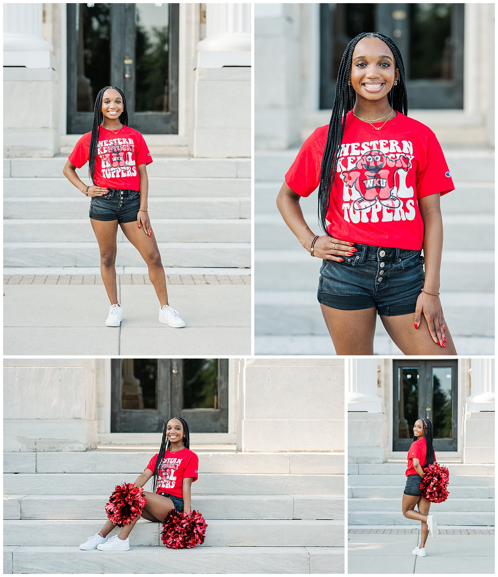 Due to the abnormally wet May and June that we had, (we were TEN INCHES above average!) I had to break up the Senior Team’s Cap & Gown & College T-shirt photos. Because of their busy schedules, we scheduled everyone’s session separately. A few weeks ago, I had the joy of photographing Leyla’s senior cap & gown and college t-shirt session in Lebanon, TN. Just TWO DAYS before she packed up for Western Kentucky University, we were able to squeeze in her session to celebrate her amazing accomplishments and exciting future. I loved that she brought along her poms and rally towel, and we incorporated them into her photos.